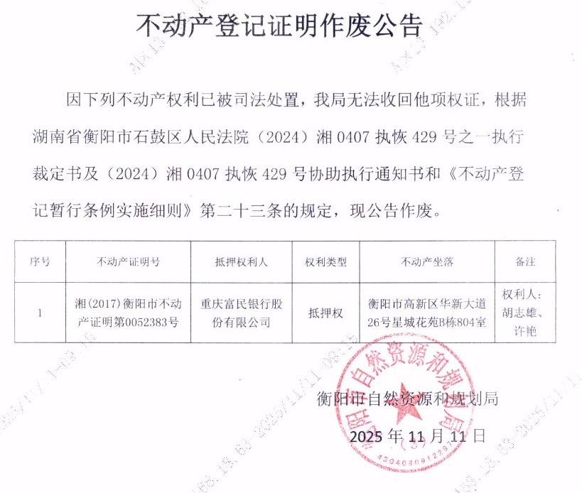关于重庆富民银行股份有限公司不动产登记证明作废公告