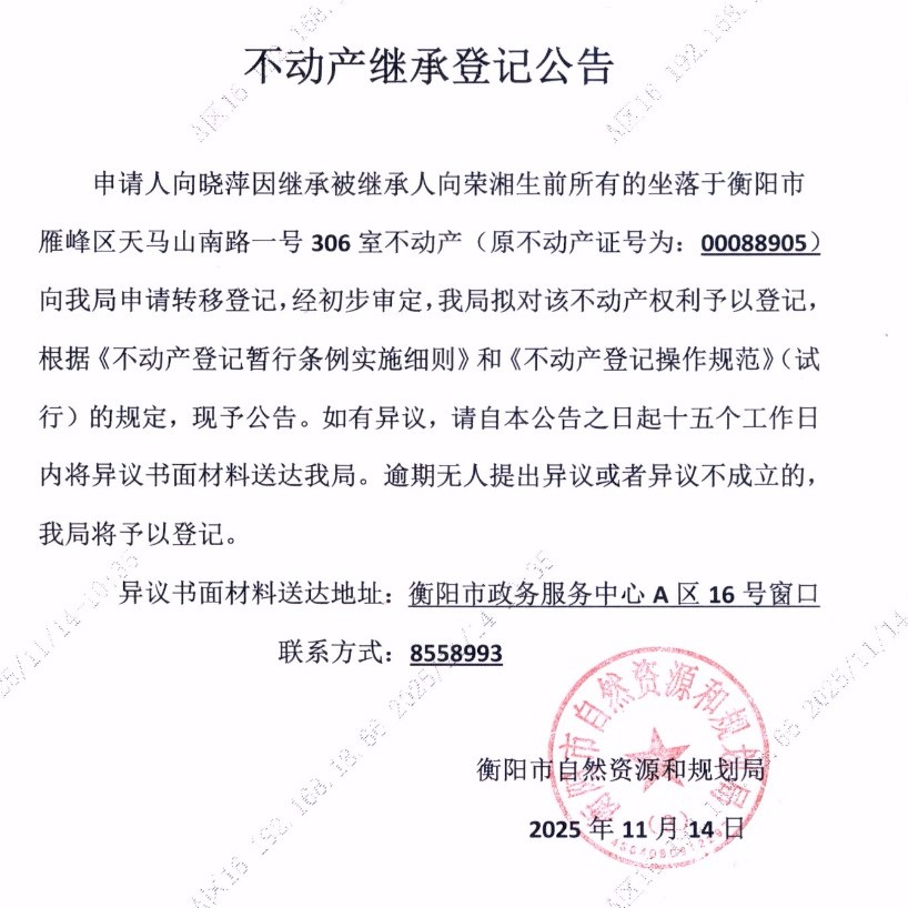 关于向晓萍继承向荣湘不动产登记的公告