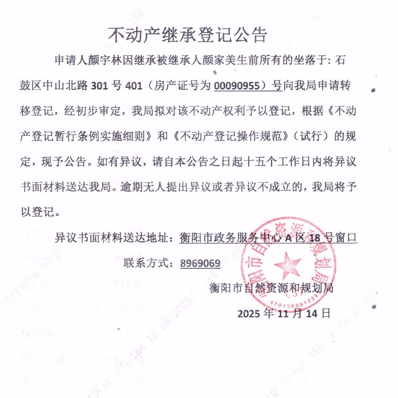 关于颜宇林继承颜家美不动产登记的公告