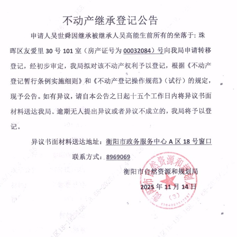 关于吴世舜继承吴高能不动产登记的公告