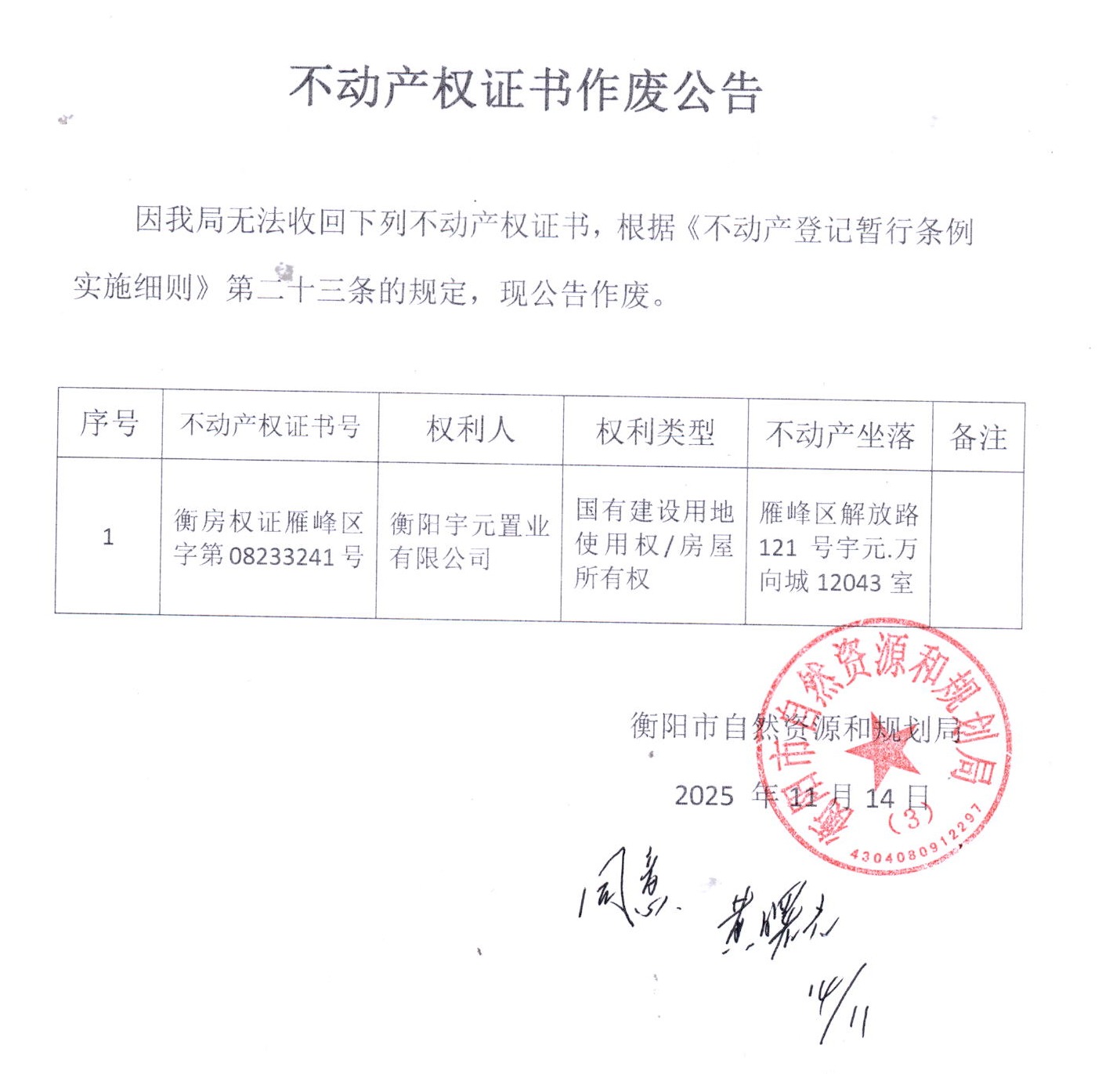 关于衡阳宇元置业有限公司不动产权证书作废的公告