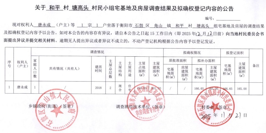 关于和平村塘高头村民小组宅基地及房屋调查结果及拟确权登记内容的公告