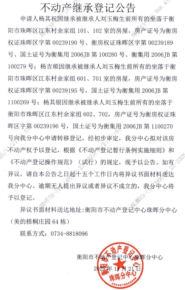 关于杨其祝、杨吉顺、杨其银继承刘玉梅不动产登记的公告