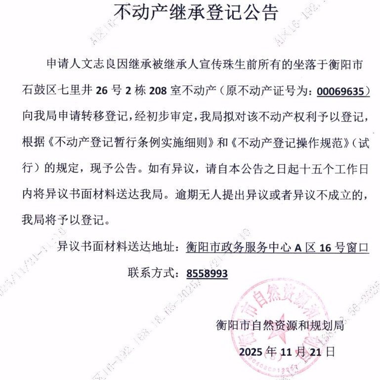 关于文志良继承宣传珠不动产登记的公告