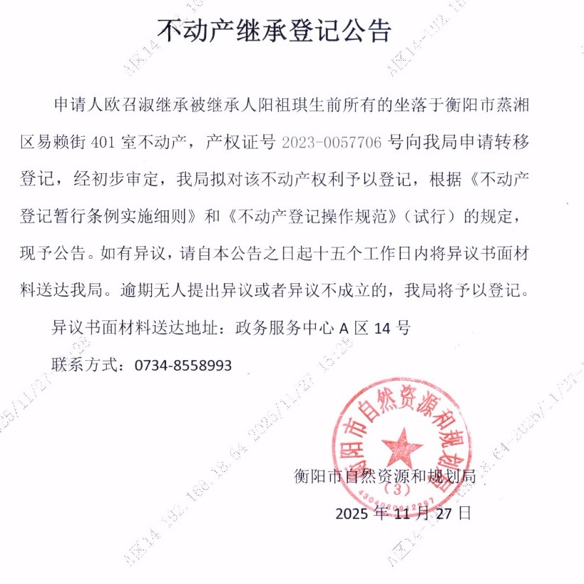 关于欧召淑继承阳祖琪不动产登记的公告
