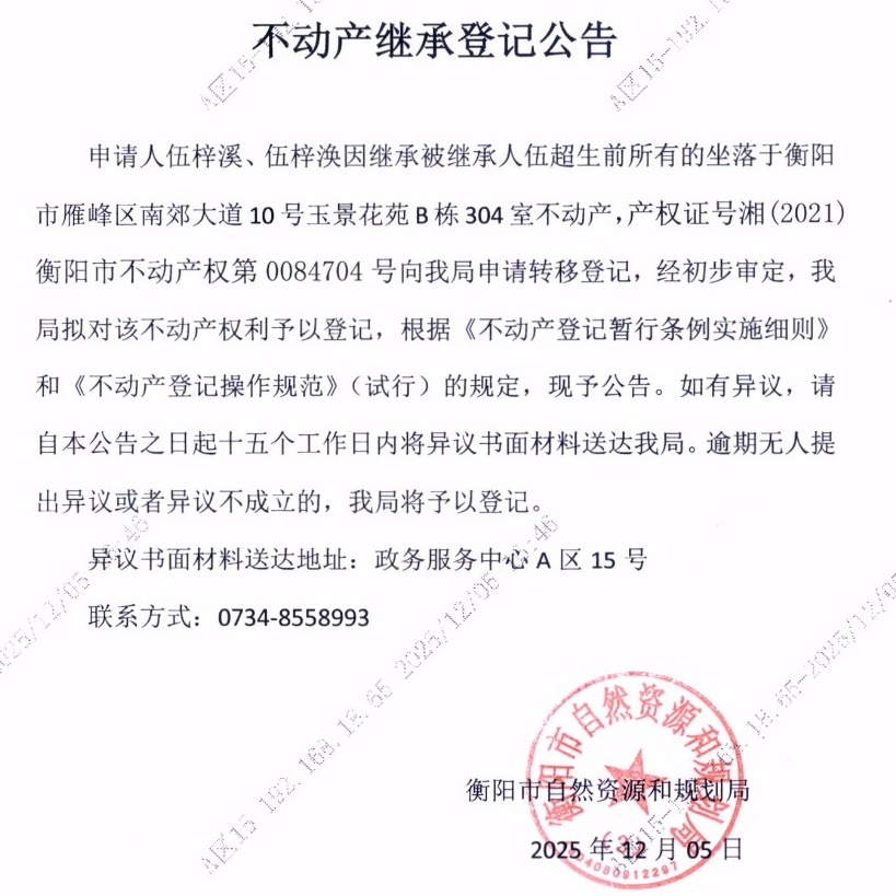 关于伍梓溪、伍梓涣继承伍超不动产登记的公告