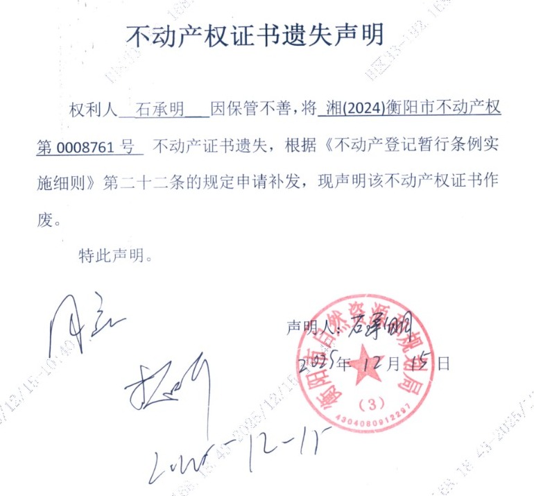 关于石承明不动产证书遗失声明的公告
