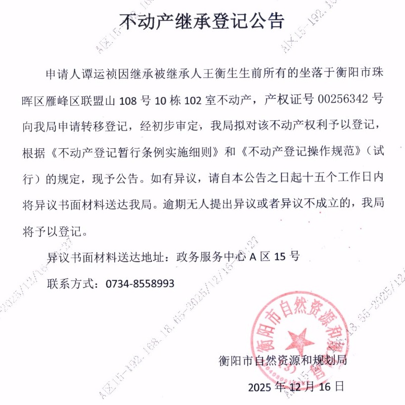 关于谭运祯继承王衡生不动产登记的公告