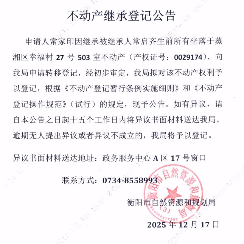 关于常家印继承常启齐不动产登记的公告