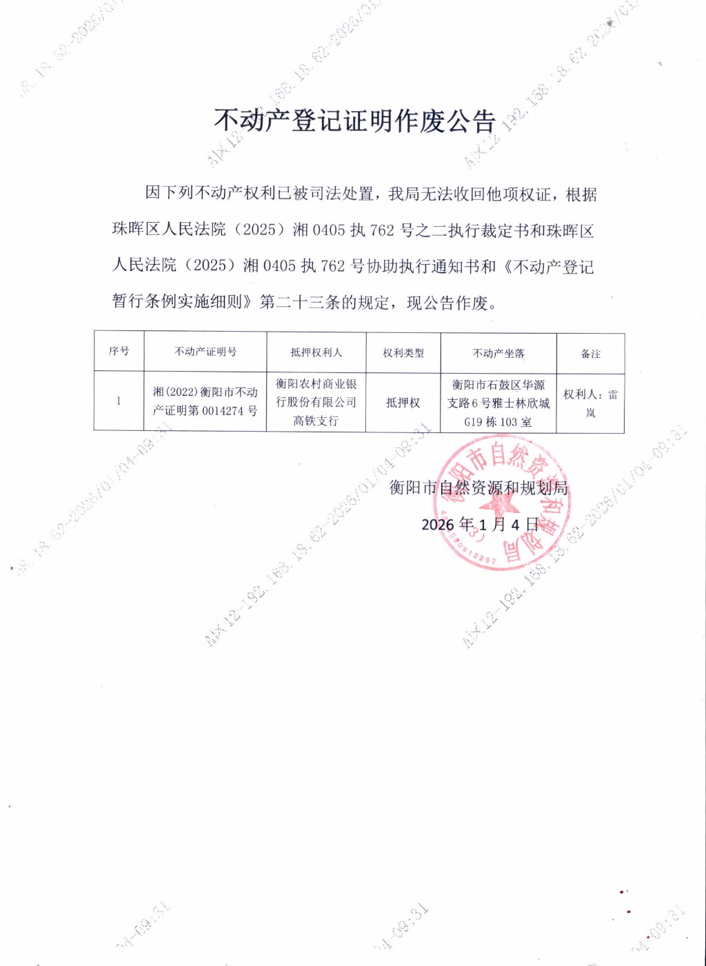 关于衡阳农村商业银行股份有限公司高铁支行不动产权证明作废公告