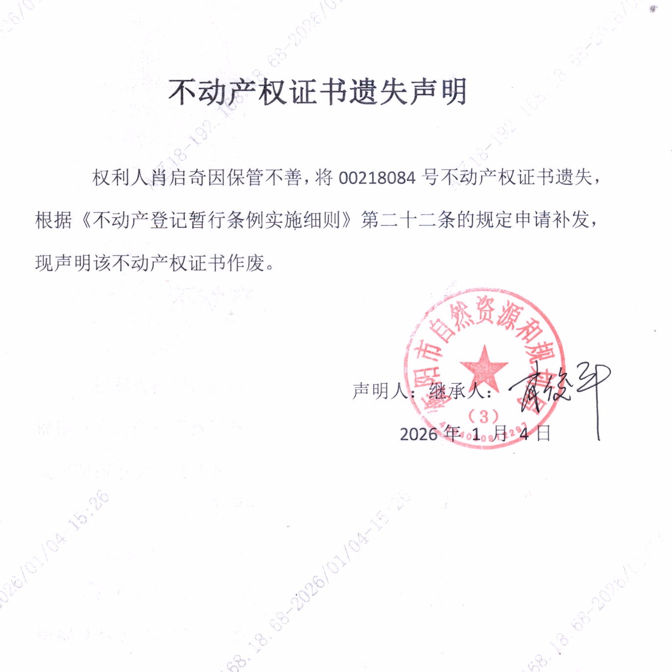 关于肖启奇不动产权证书遗失声明的公告