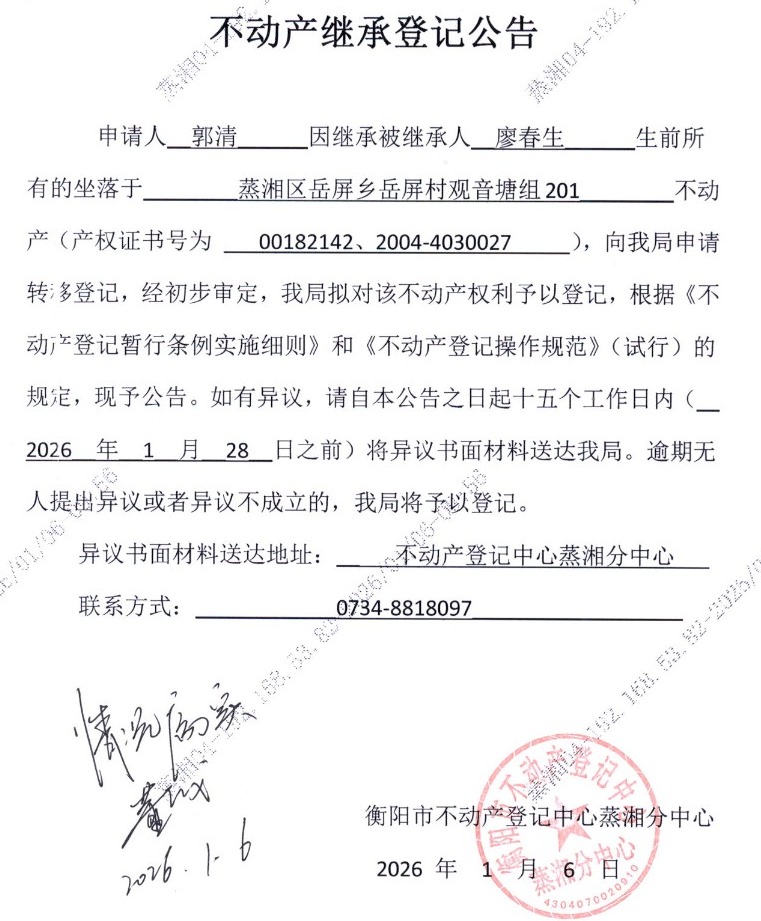 关于郭清继承廖春生不动产登记的公告