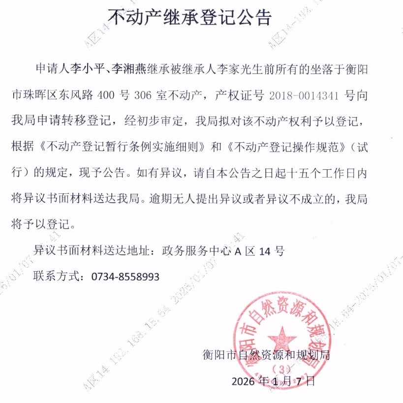 关于李小平、李湘燕继承李家光不动产登记的公告