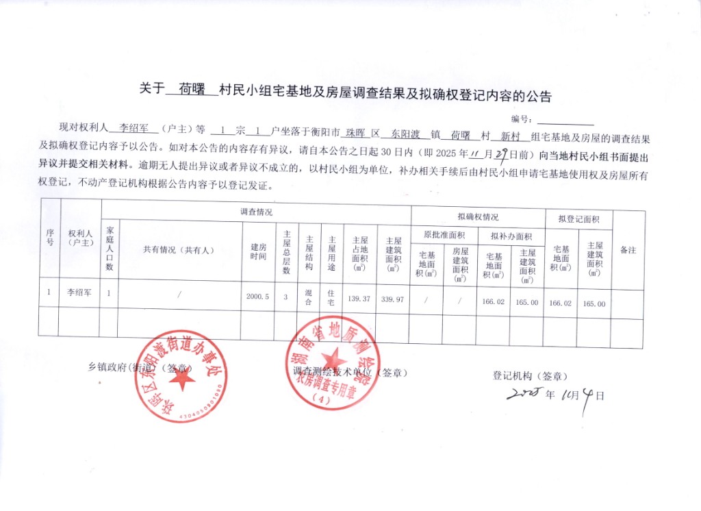 关于荷曙村李绍军宅基地及房屋调查结果及拟确权登记内容的公告