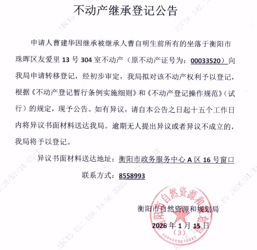 关于曹建华继承曹自明不动产登记的公告