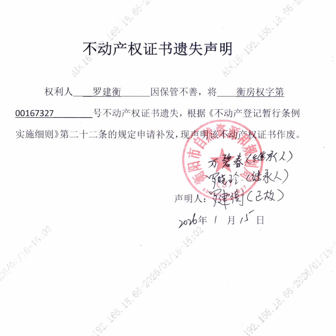 关于罗建衡不动产权证遗失声明的公告