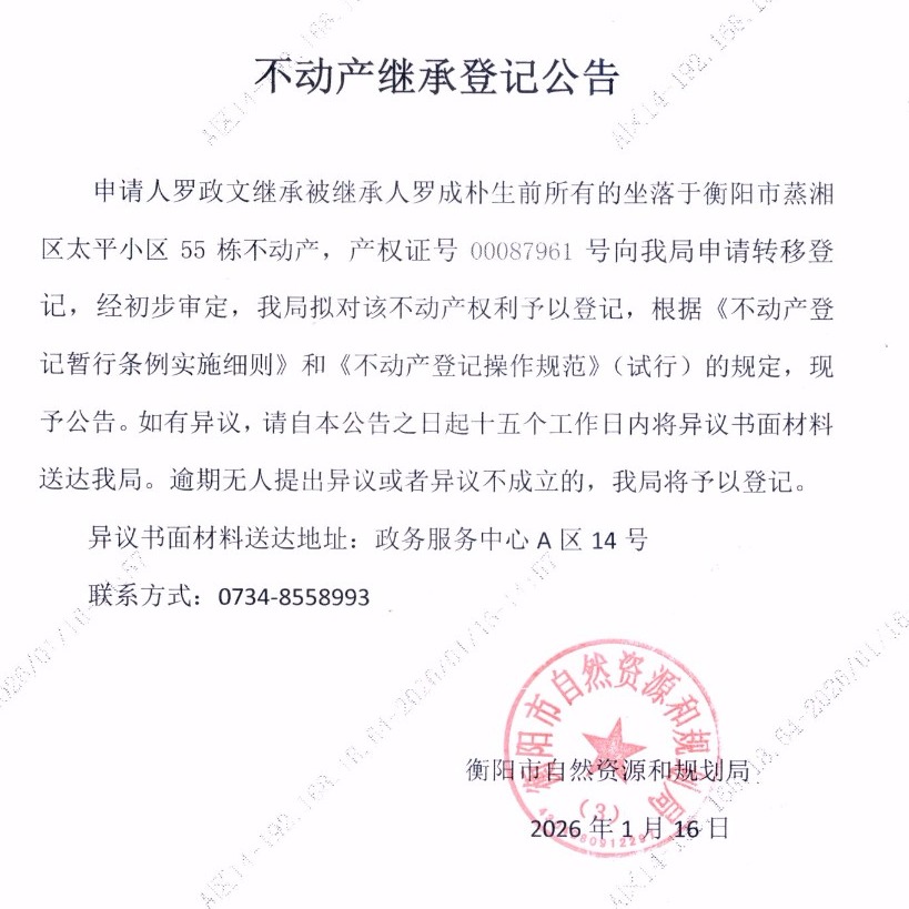 关于罗政文继承罗成朴不动产登记的公告