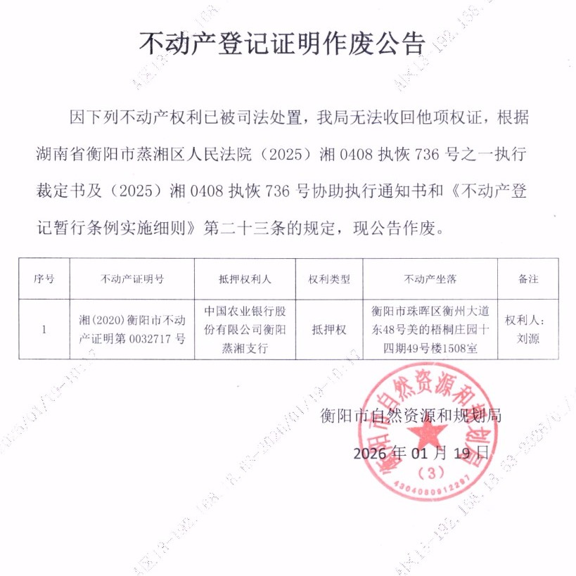 关于中国农业银行股份有限公司衡阳蒸湘支行不动产登记证明作废公告