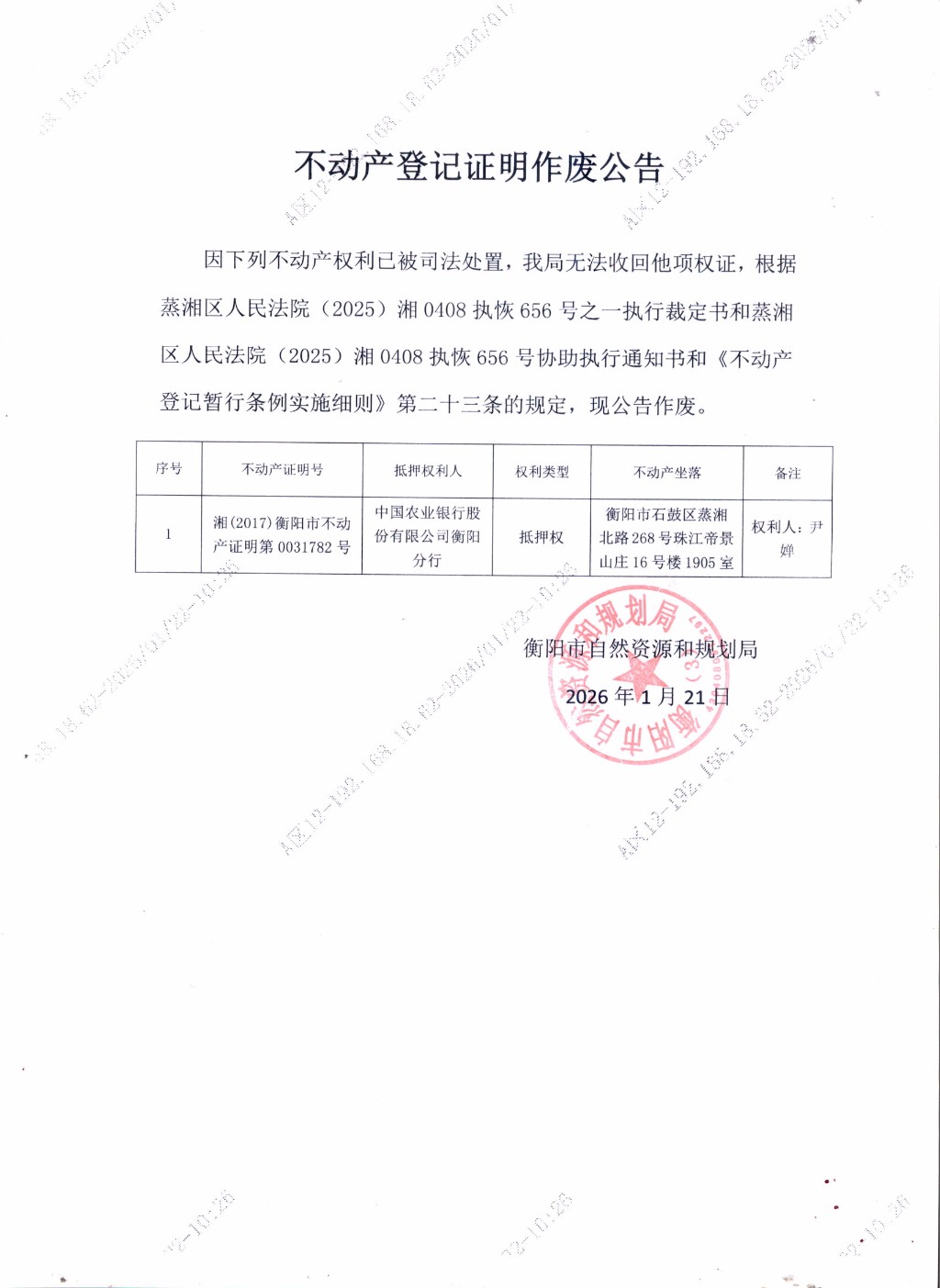 关于中国农业银行股份有限公司衡阳分行不动产登记证明作废公告