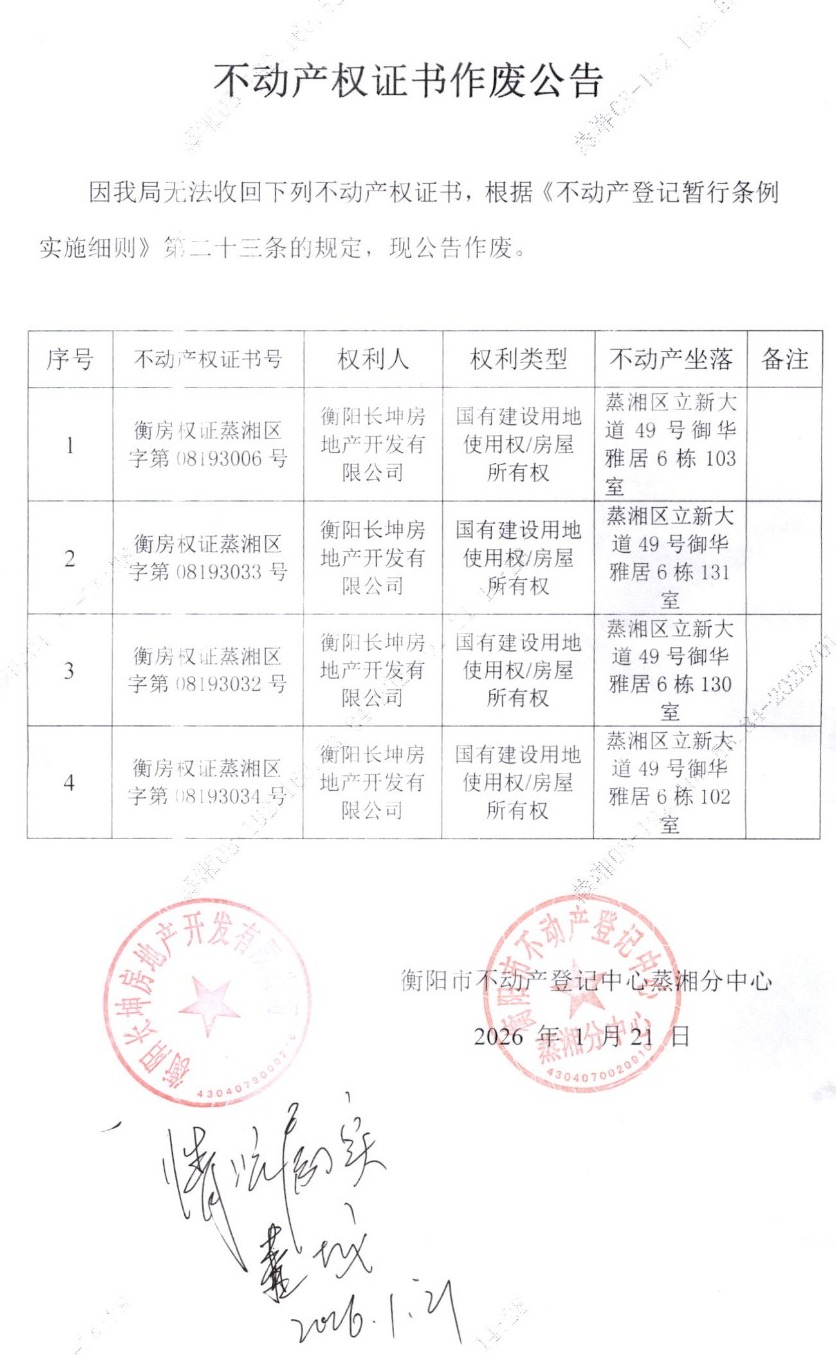关于衡阳长坤房地产开发有限公司不动产权证书作废公告