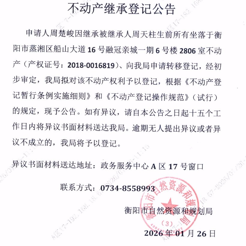 关于周楚峻继承周天柱不动产登记的公告
