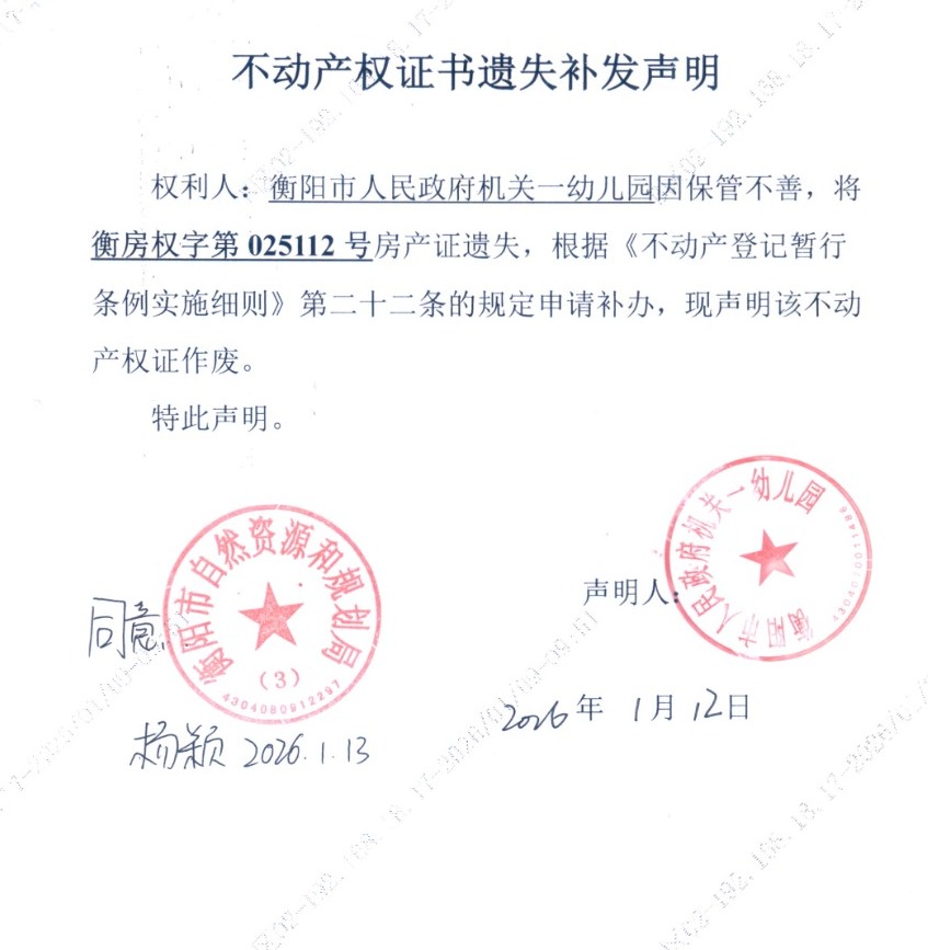 关于衡阳市人民政府机关一幼儿园房产证遗失声明