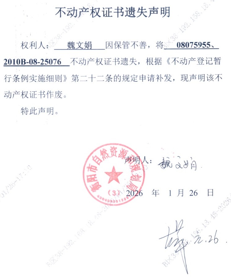 关于魏文娟不动产权证书遗失声明的公告