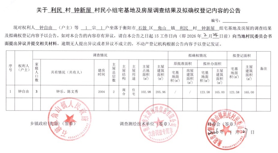 关于利民村钟新屋村民小组宅基地及房屋调查结果及拟确权登记内容的公告