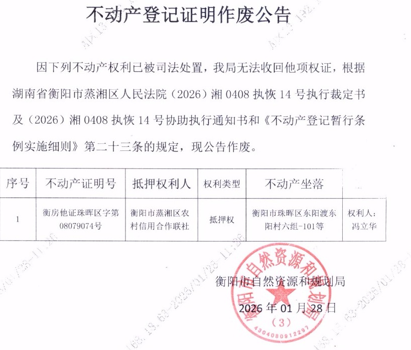 关于衡阳市蒸湘区农村信用合作联社不动产登记证明作废公告