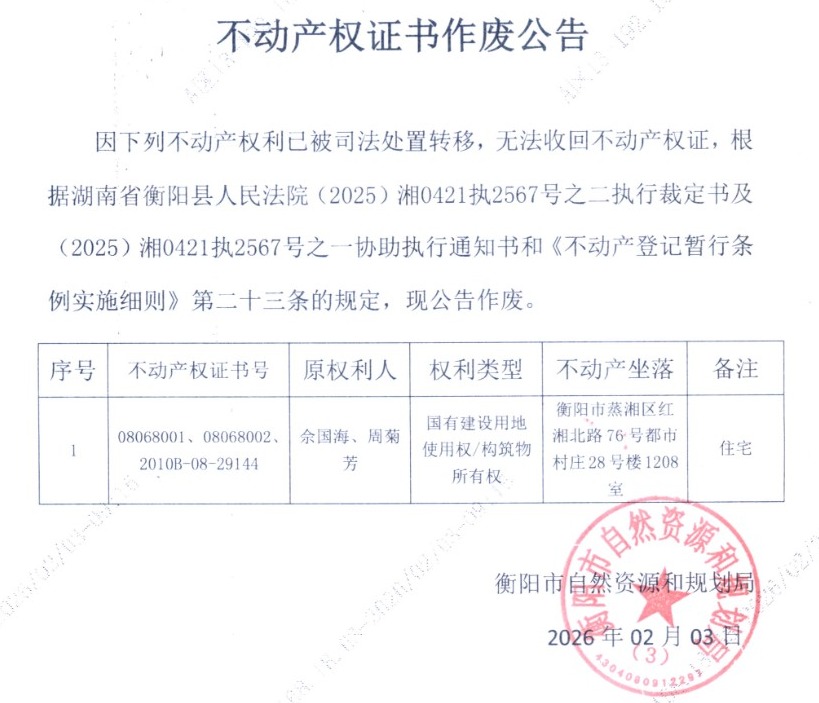 关于佘国海、周菊芳不动产权证书作废公告