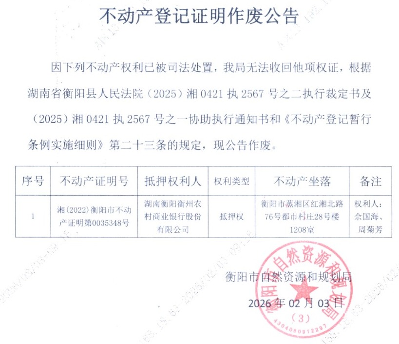 关于湖南衡阳衡州农村商业银行股份有限公司不动产登记证明作废公告