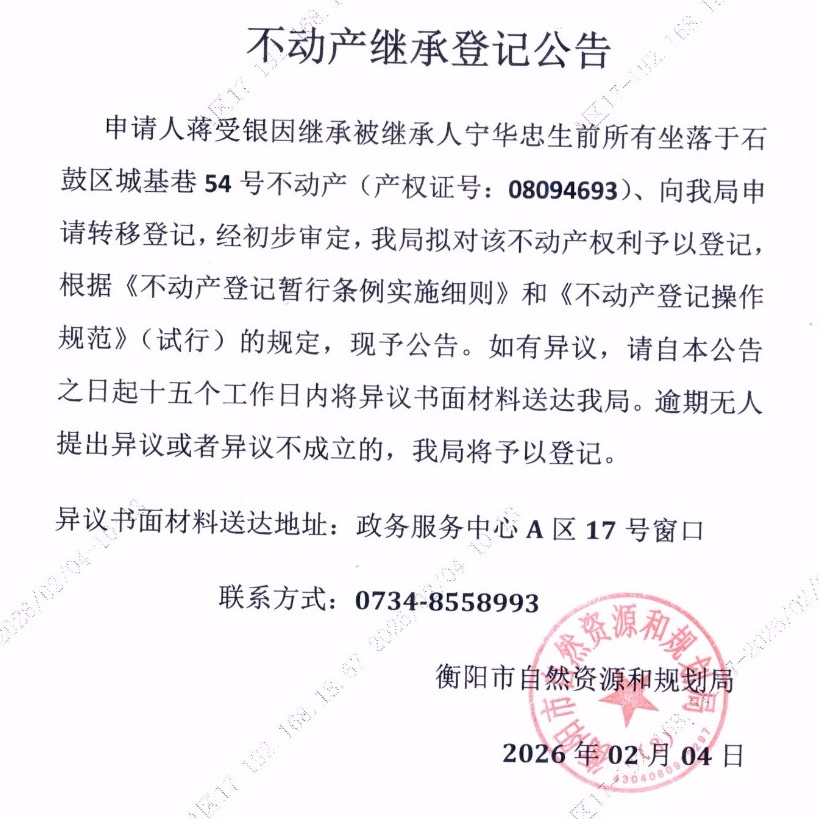 关于蒋受银继承宁华忠不动产登记的公告