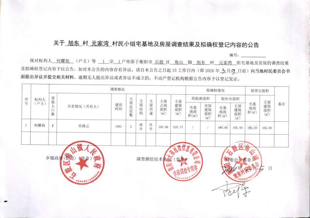 关于旭东村元家湾村民小组宅基地及房屋调查结果及拟确权登记内容的公告