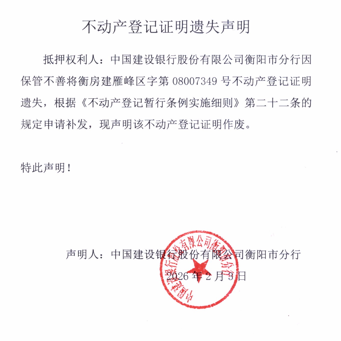 关于中国建设银行股份有限公司衡阳市分行不动产登记证明遗失声明的公告