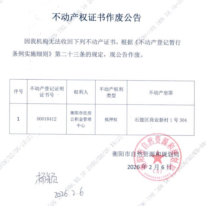 关于衡阳市住房公积金管理中心他项权证作废的公告