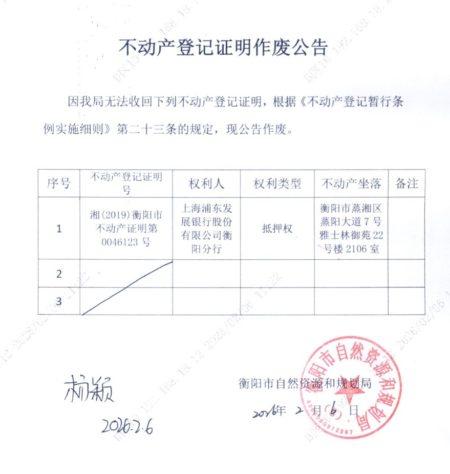 关于上海浦东发展银行股份有限公司衡阳分行不动产登记证明作废公告