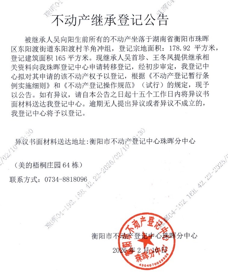 关于吴首珍、王冬凤继承吴向阳不动产登记的公告