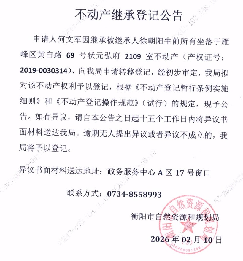 关于何文军继承徐朝阳不动产登记的公告