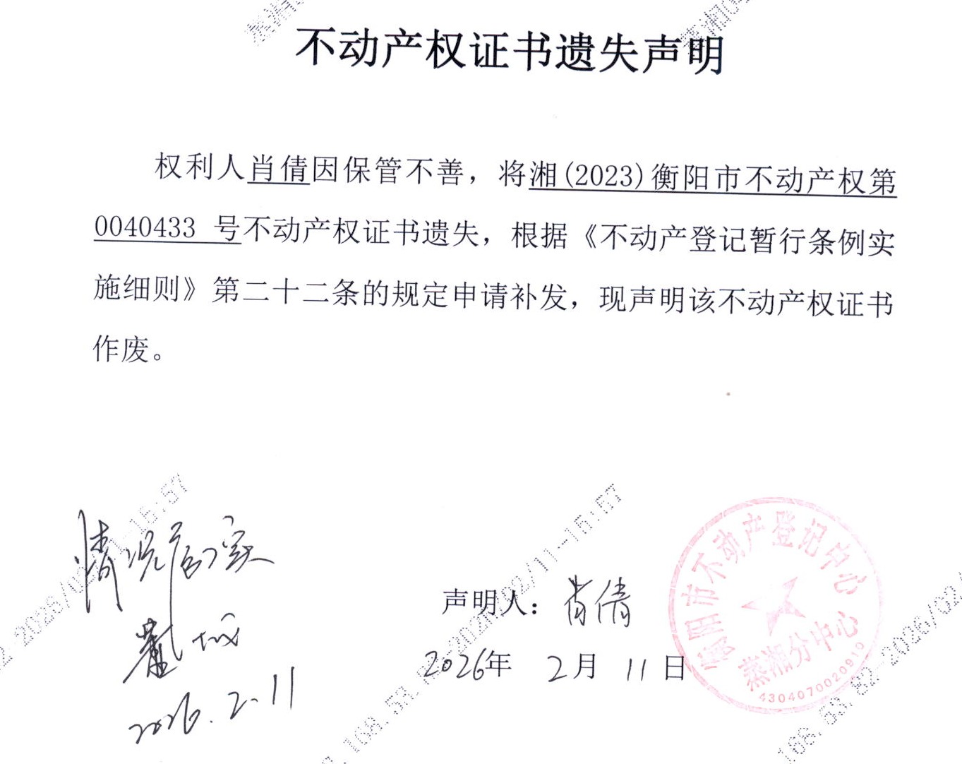 关于肖倩不动产权证书遗失声明