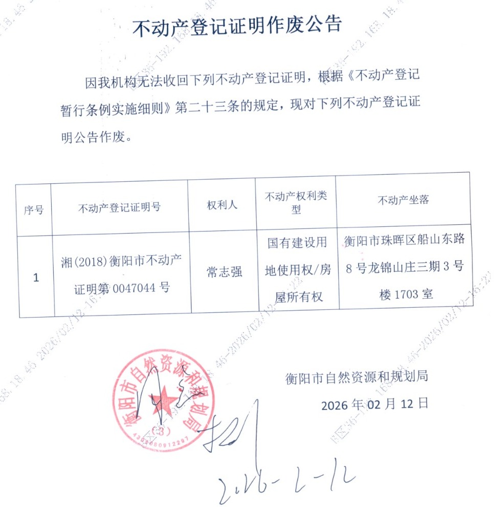 关于常志强不动产登记证明作废公告