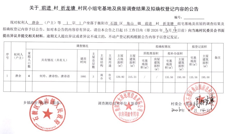 关于前进村折龙塘村民小组宅基地及房屋调查结果及拟确权登记内容的公告