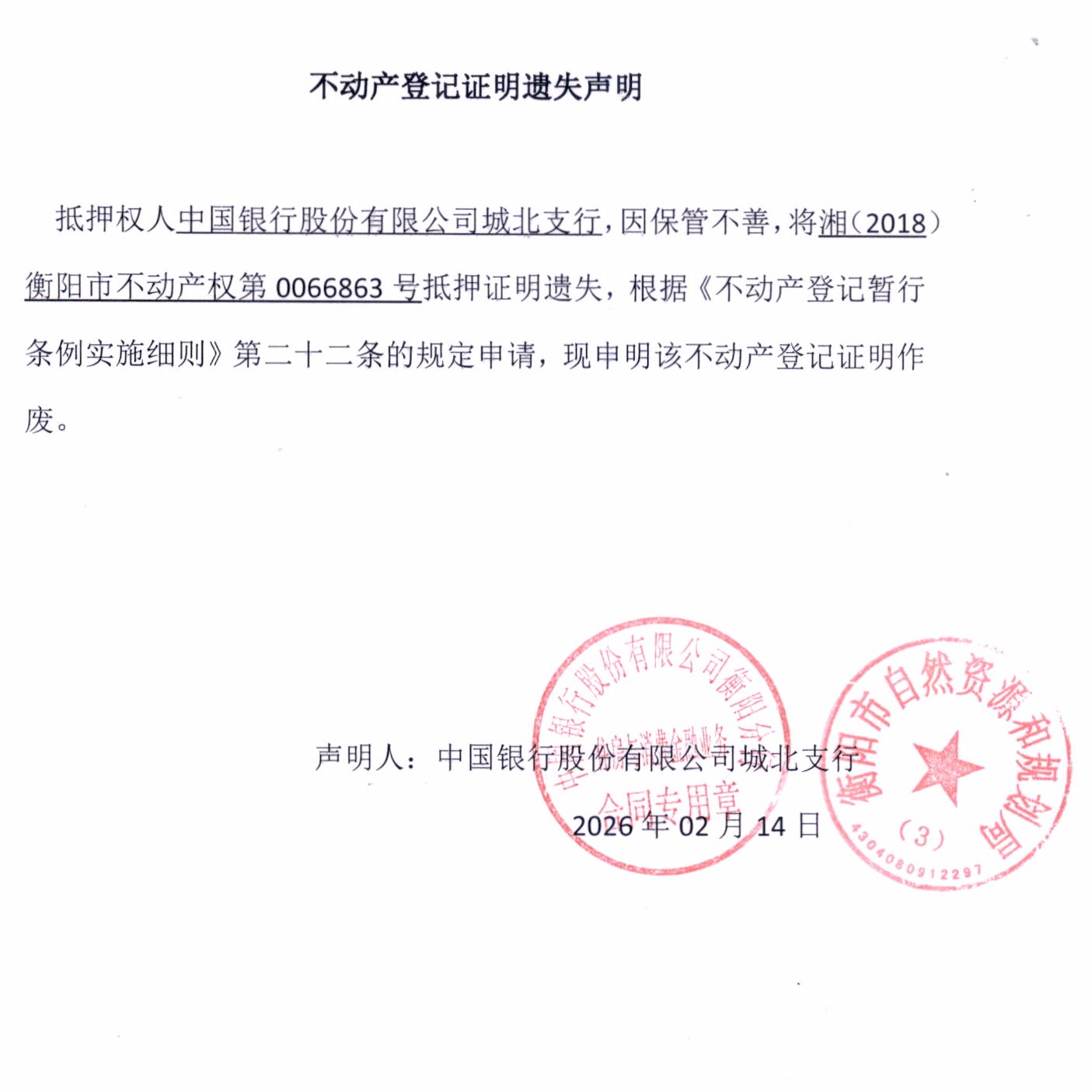 关于中国银行股份有限公司城北支行不动产登记证明遗失声明的公告