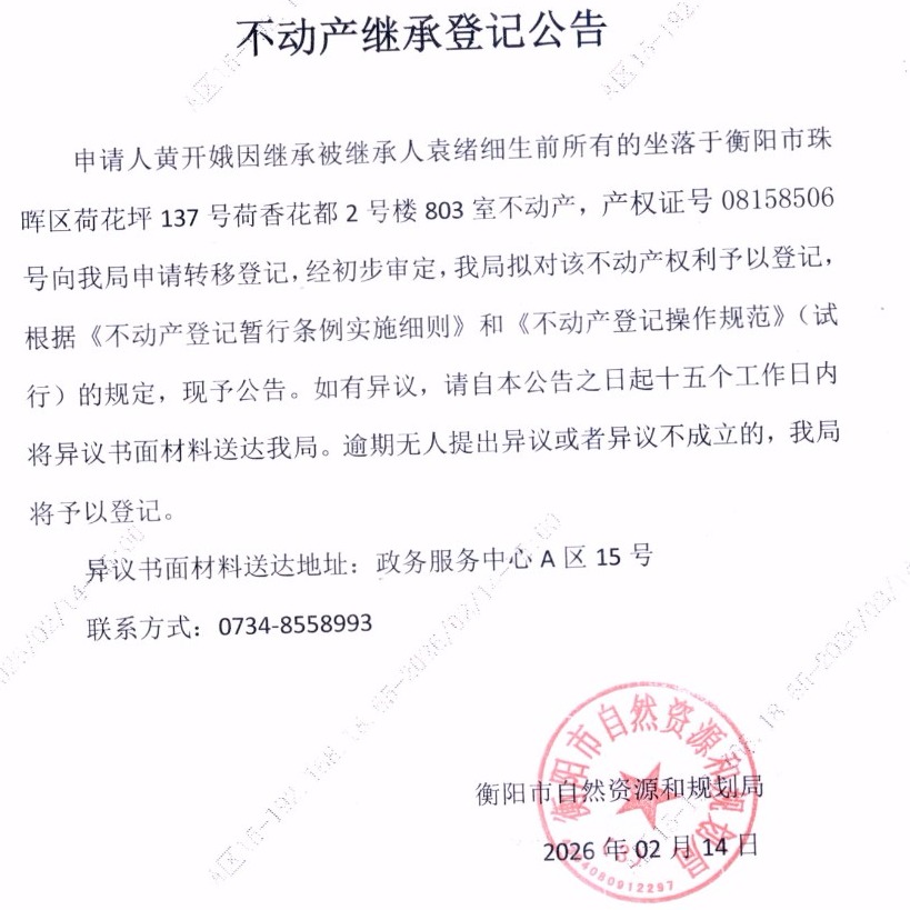 关于黄开娥继承袁绪细不动产登记的公告