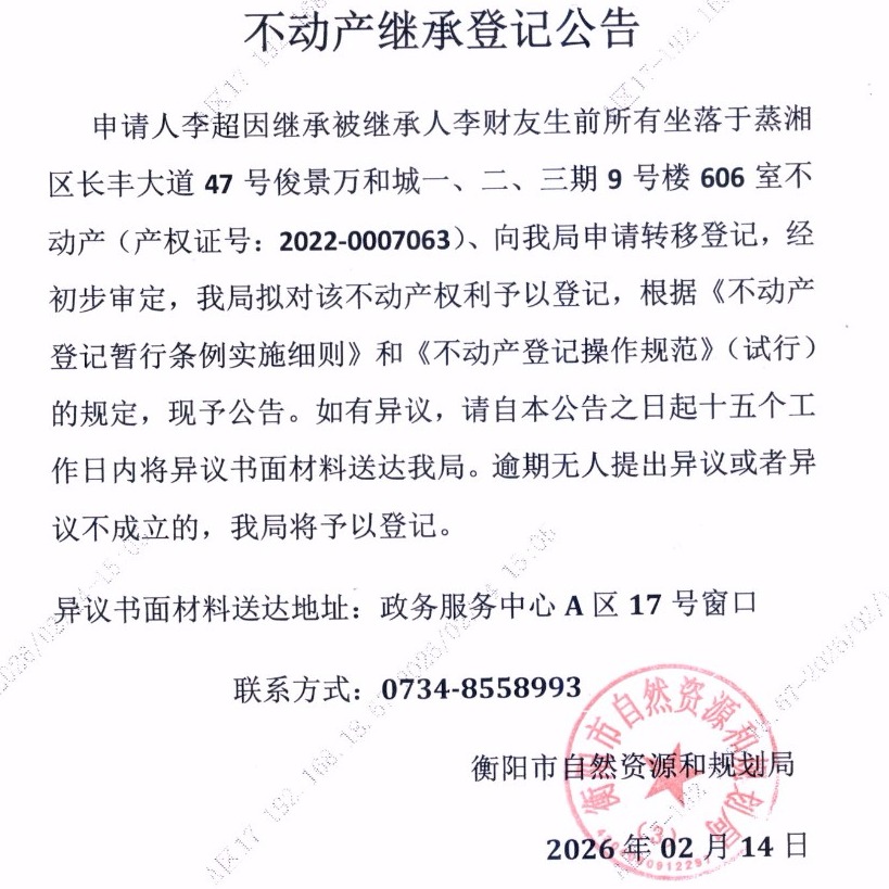 关于李超继承李财友不动产登记的公告