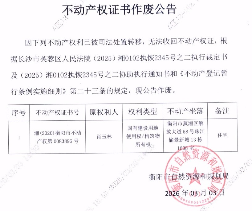 关于肖玉林不动产权证书作废公告