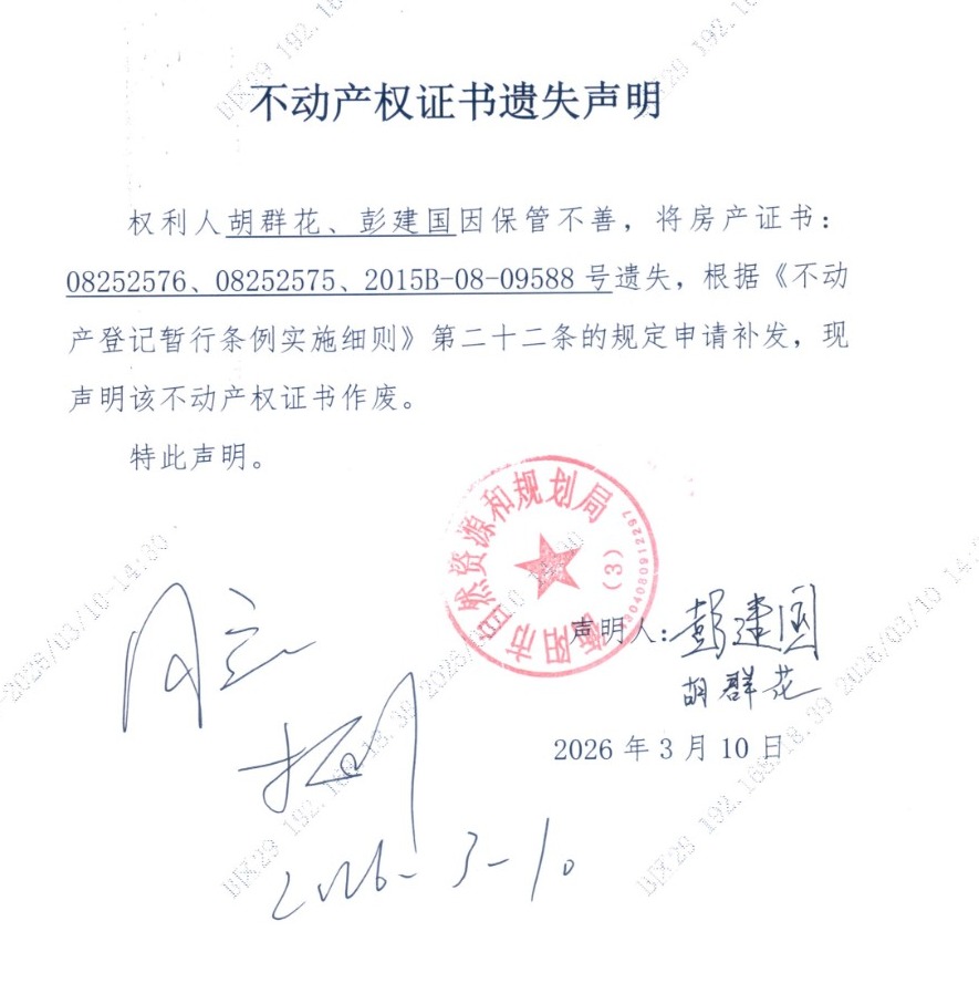 关于胡群花、彭建国不动产权证书的遗失声明