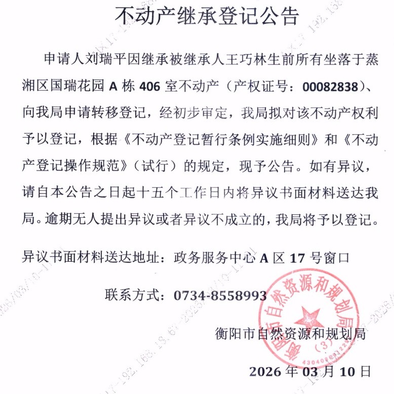 关于刘瑞平继承王巧林不动产登记的公告