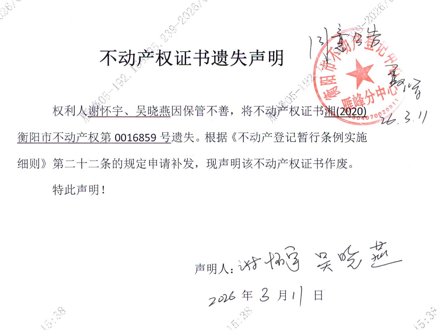 关于谢怀宇、吴晓燕不动产权证书遗失声明