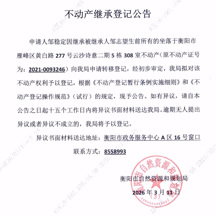 关于邹稳定继承邹志望不动产登记的公告