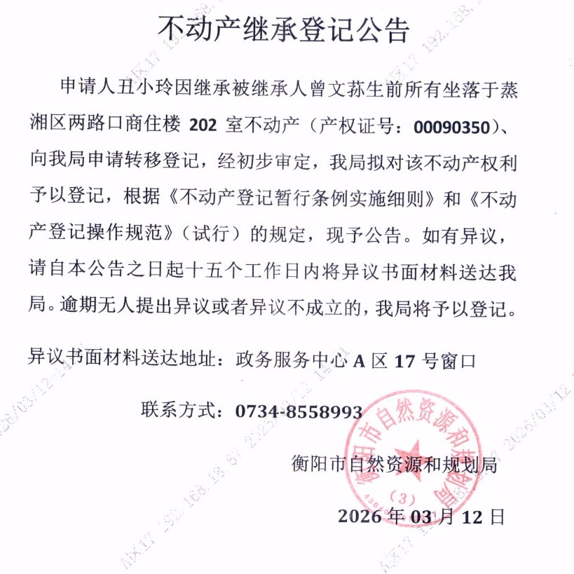 关于丑小玲继承曾文荪不动产登记的公告